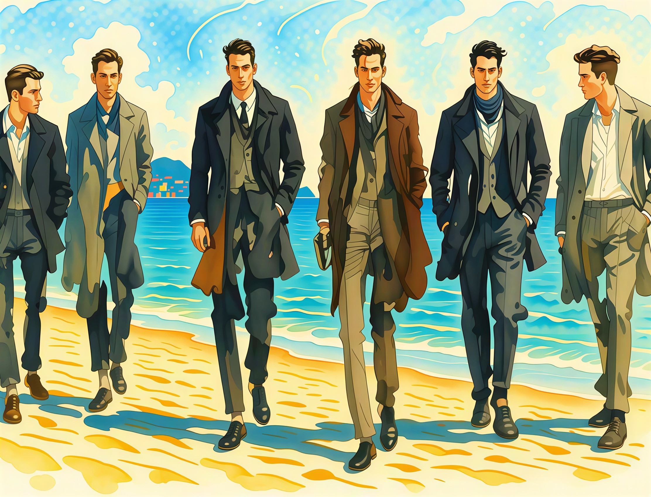 Six men in formal long coats and attire, wearing dress shoes, stroll along a sunny beach with clear blue water and vivid yellow sand, under a sky with light blue clouds. The men are depicted in a cartoonish, slightly anime-like style, with some looking towards the viewer.