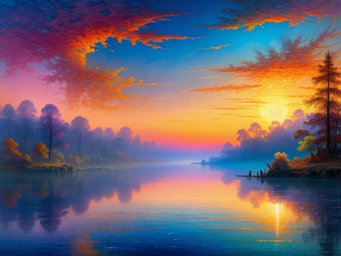 Serene sunrise over a misty lake with colorful trees, a vivid sky gradient from deep blue to orange, with warm light reflecting on calm waters.