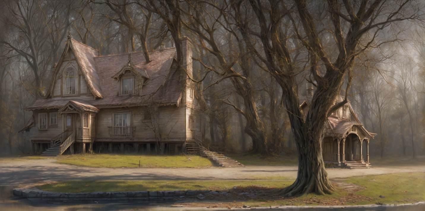 Mystical Landscape with Vintage Houses and Reflective Pond