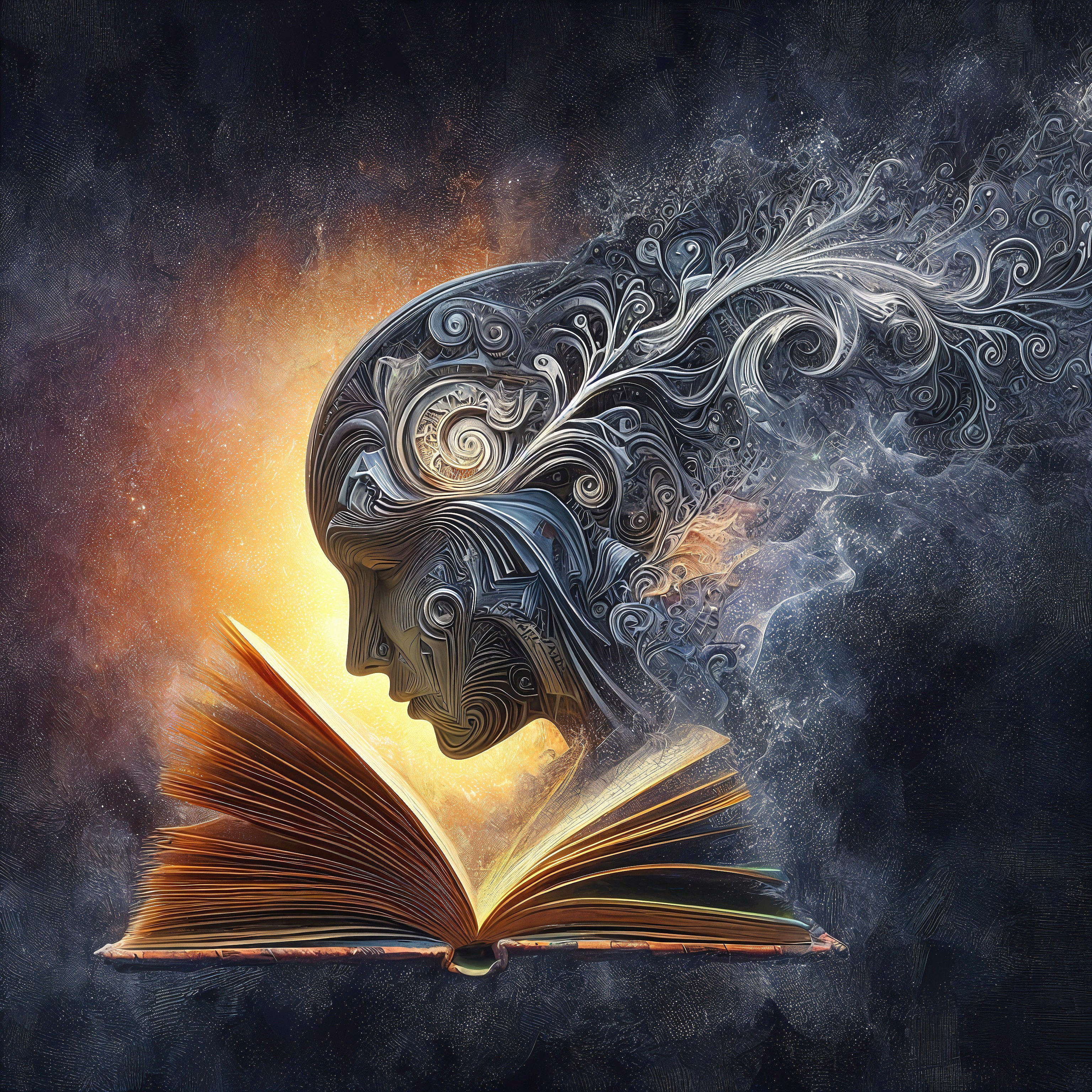 The image features an intricately designed silhouette of a head emerging from an open book, with swirling patterns and light, symbolizing knowledge and imagination.