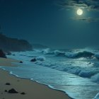 A serene beach scene under a full moon, with gentle waves lapping the shore. The rocky cliffs create a dramatic backdrop, while the starry sky adds a tranquil, magical atmosphere.