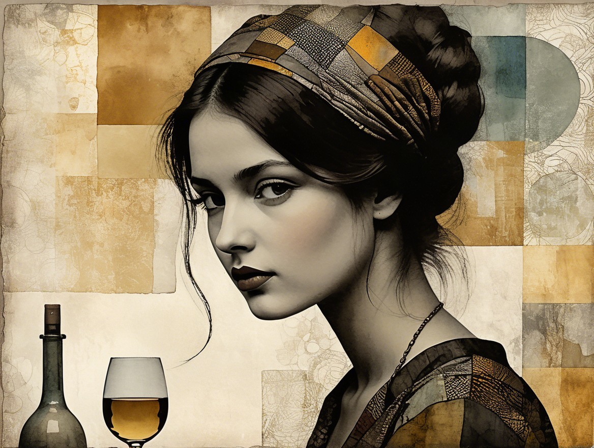 A serene, ethereal woman with dark hair adorned in flowers gazes thoughtfully. She sits beside a wine glass, framed by soft, floral elements, creating a harmonious, dreamlike atmosphere.