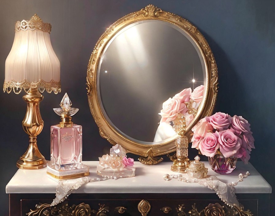 Elegant dresser with a mirror, pink roses in a gold vase, pearls, a lamp, perfume bottle, and a delicate lace fabric.