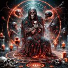 A skeletal figure clad in dark robes sits in a mystical setting. Surrounded by flickering flames and glowing symbols, it exudes an aura of dark magic and ancient power.