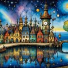 A serene woman in a flowing red dress sits on a colorful, gem-studded seat. Behind her, a vibrant, fantastical village with colorful towers stands against a deep blue sky and shimmering waters.