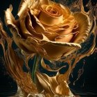 A stunning golden rose glistens with droplets of water, set against a dark background. Its petals elegantly curve, showcasing a luxurious sheen and a mesmerizing, radiant beauty.