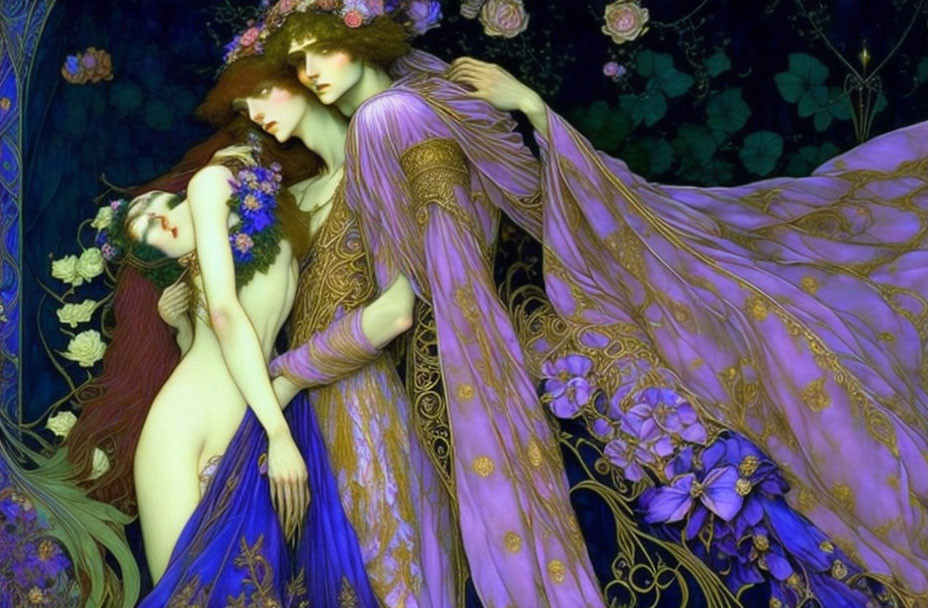 Ethereal figures embracing in purple robes amidst enchanting roses