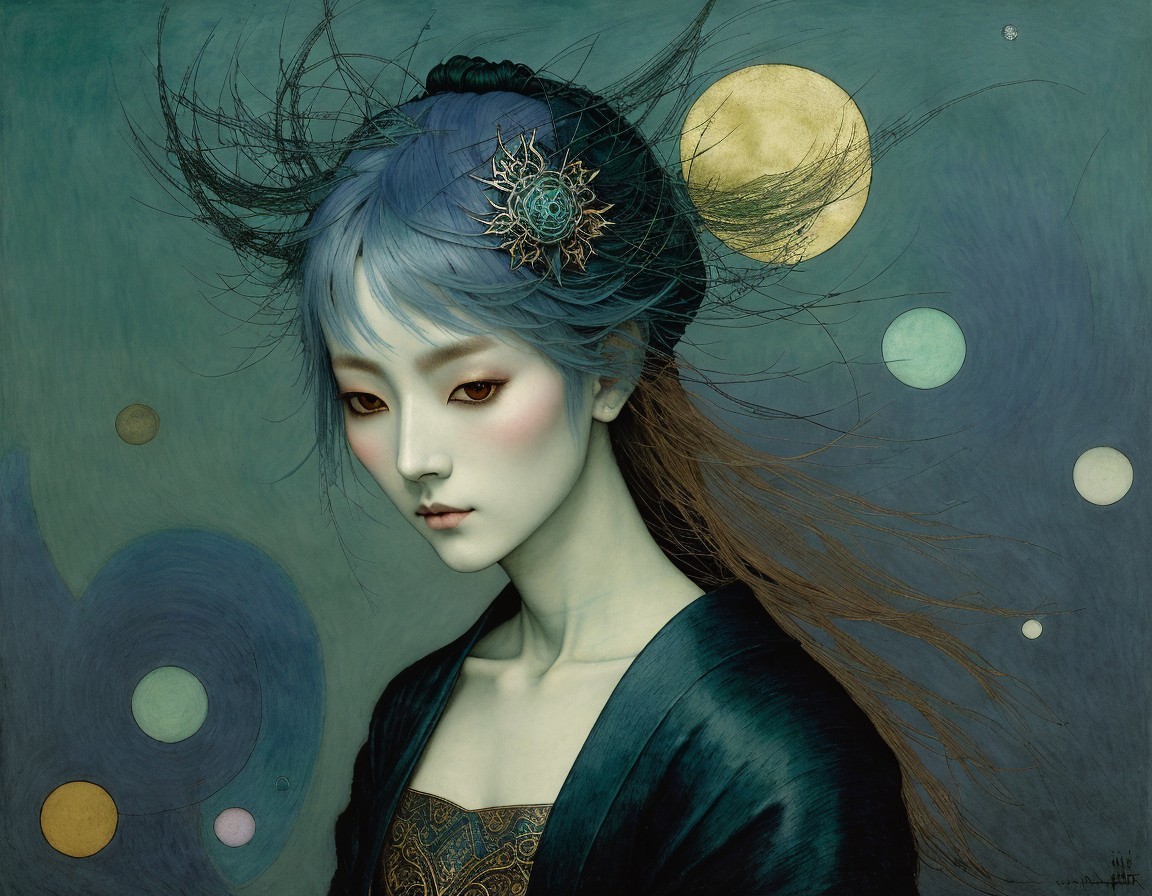 The image features a young woman with flowing hair, gazing thoughtfully. Behind her are stylized sunlit landscapes with geometric shapes, alongside quaint houses and a church tower.