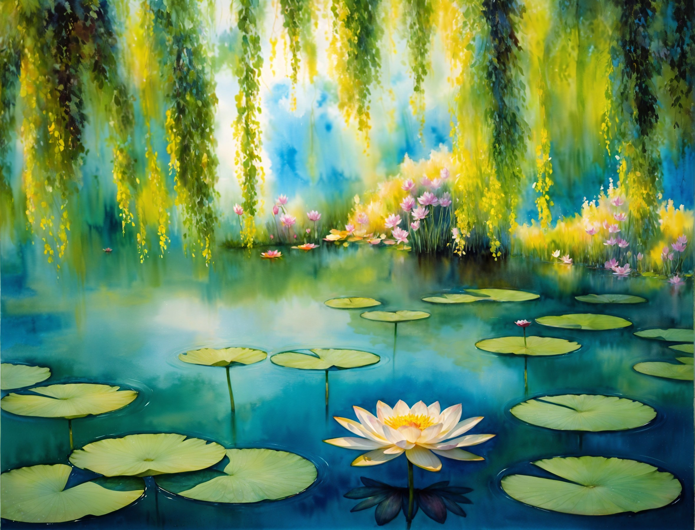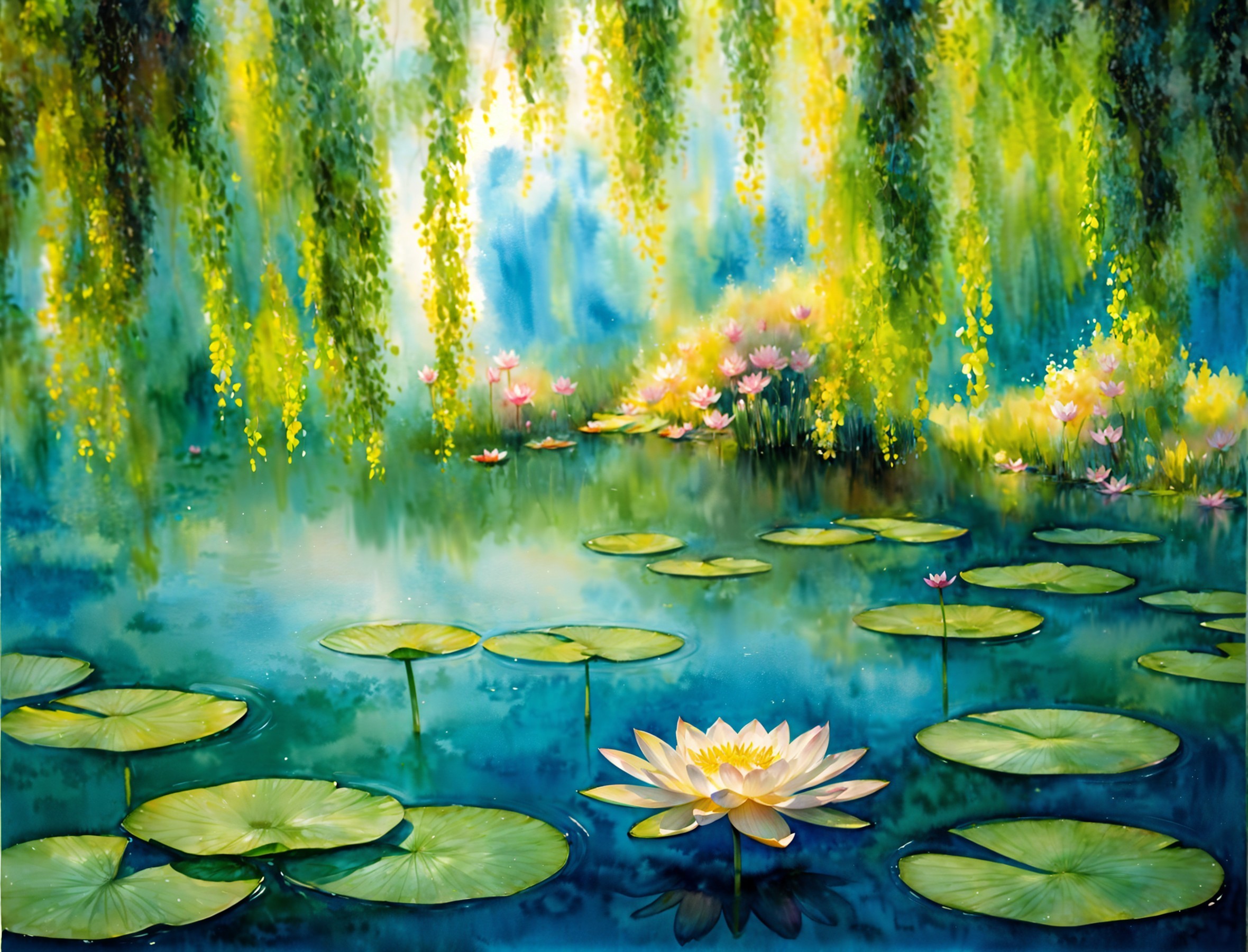 A serene water scene features delicate water lilies floating on a tranquil pond, surrounded by lush greenery and cascading vines, illuminated by soft, dappled light. A peaceful oasis.