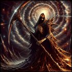 Mystical Figure with Skull Mask in Cosmic Landscape