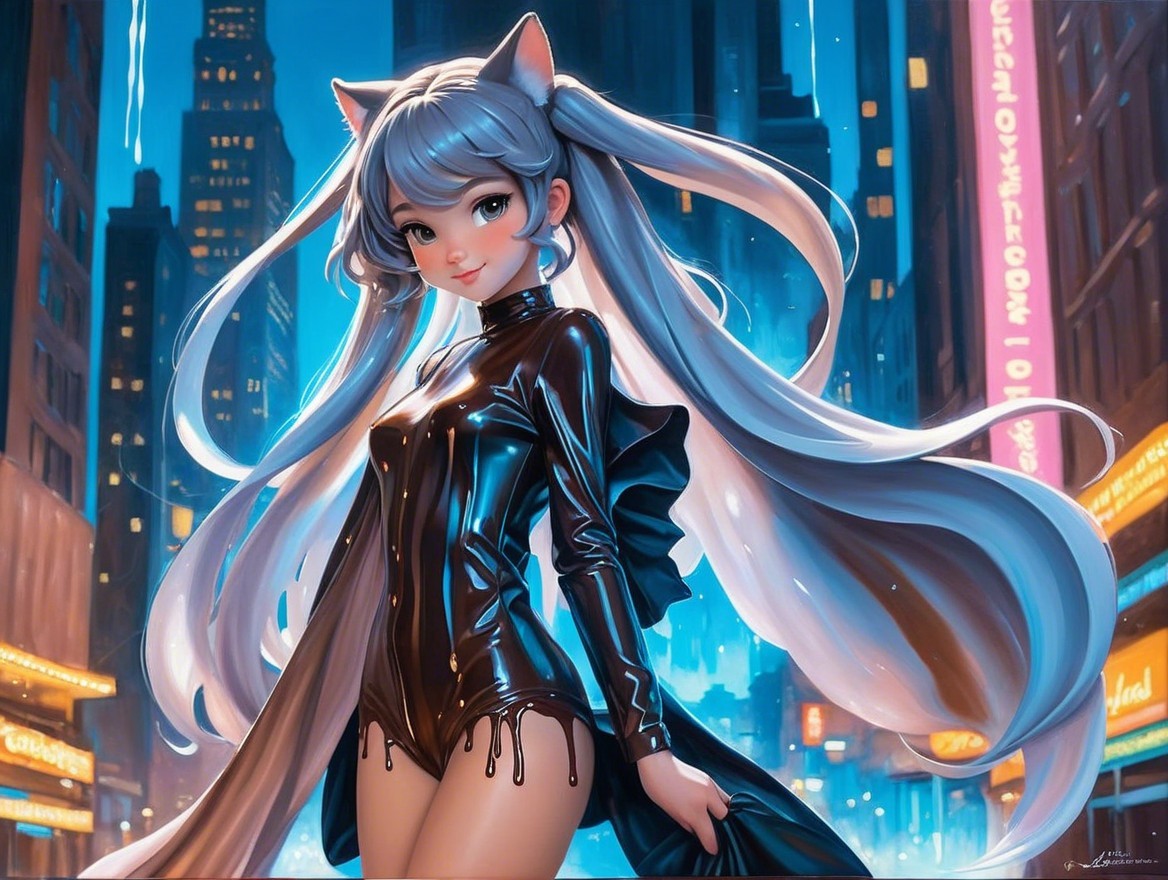 + Prompt:A mesmerizing, highly detailed painting of a beautiful and cute melting 26 year's old chocolate white girl, embodying warmth, sweetness, and elegance. Her smooth, rich chocolate-toned skin appears to glisten as if melting slightly in the soft glow of her surroundings, with rivulets of molten chocolate cascading delicately down her arms and shoulders. She has large, expressive eyes with golden-brown irises that shimmer like caramel, framed by long lashes and a gentle, playful smile. Her flowing hair resembles streams of melted dark and milk chocolate, interwoven with streaks of golden caramel and dustings of cocoa powder. She wears a whimsical, melting chocolate dress that flows like liquid, adorned with intricate details resembling lace made of powdered sugar and tiny chocolate curls. Her accessories include chocolate truffle earrings and a bracelet shaped like a swirl of whipped cream. The background is an enchanting confectionery world with a chocolate river, candy sprinkles, and a soft golden light, creating a magical, dreamy atmosphere. Sparkling highlights and sweet aromas swirl around her, capturing her beauty, charm, and the irresistible allure of a melting chocolate girl.