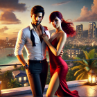 A glamorous couple poses at sunset on a balcony, overlooking a vibrant coastal city. The woman in a stunning red dress exudes elegance, while the man in a dress shirt adds charm to the scene.