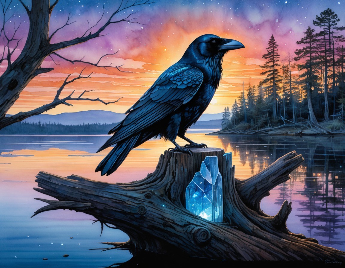 A mystical raven perches on a log by a serene lake, shimmering with colorful lights. The vibrant sunset and starry sky create a magical atmosphere, highlighting the enchanting scene.