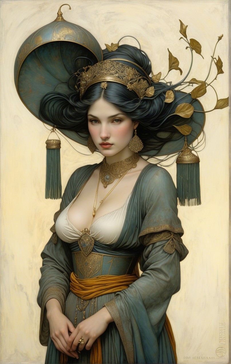 A beautifully dressed woman with flowing blue hair and a large, ornate hat adorned with ivy. She wears an intricate, elegant gown, set against a golden, circular background, exuding grace and poise.