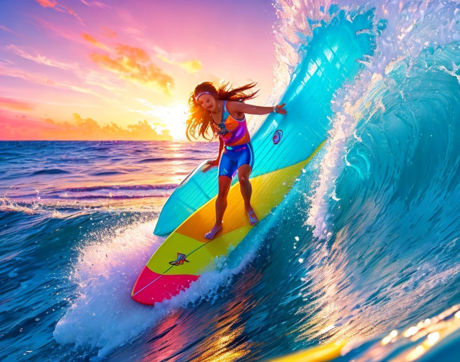 A vibrant image of a man surfing a wave at sunset with vivid colors illustrating the ocean and sky.
