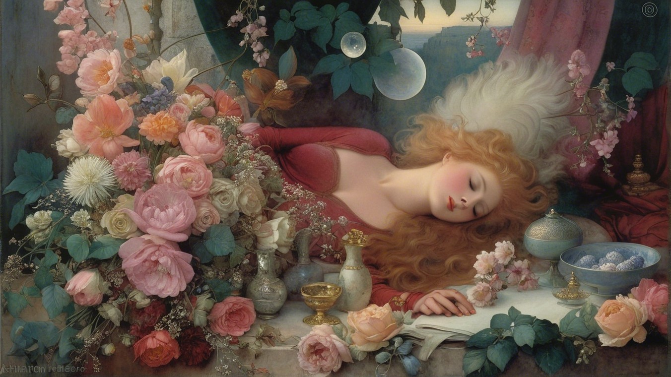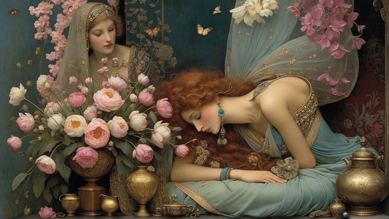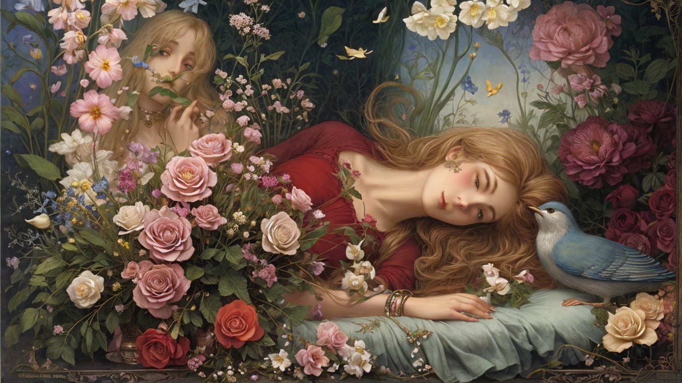 The image depicts two women in an ornate, serene setting. One woman, draped in soft blue, rests her head on her arm amid vibrant flowers, while the other gazes thoughtfully, surrounded by delicate blossoms.