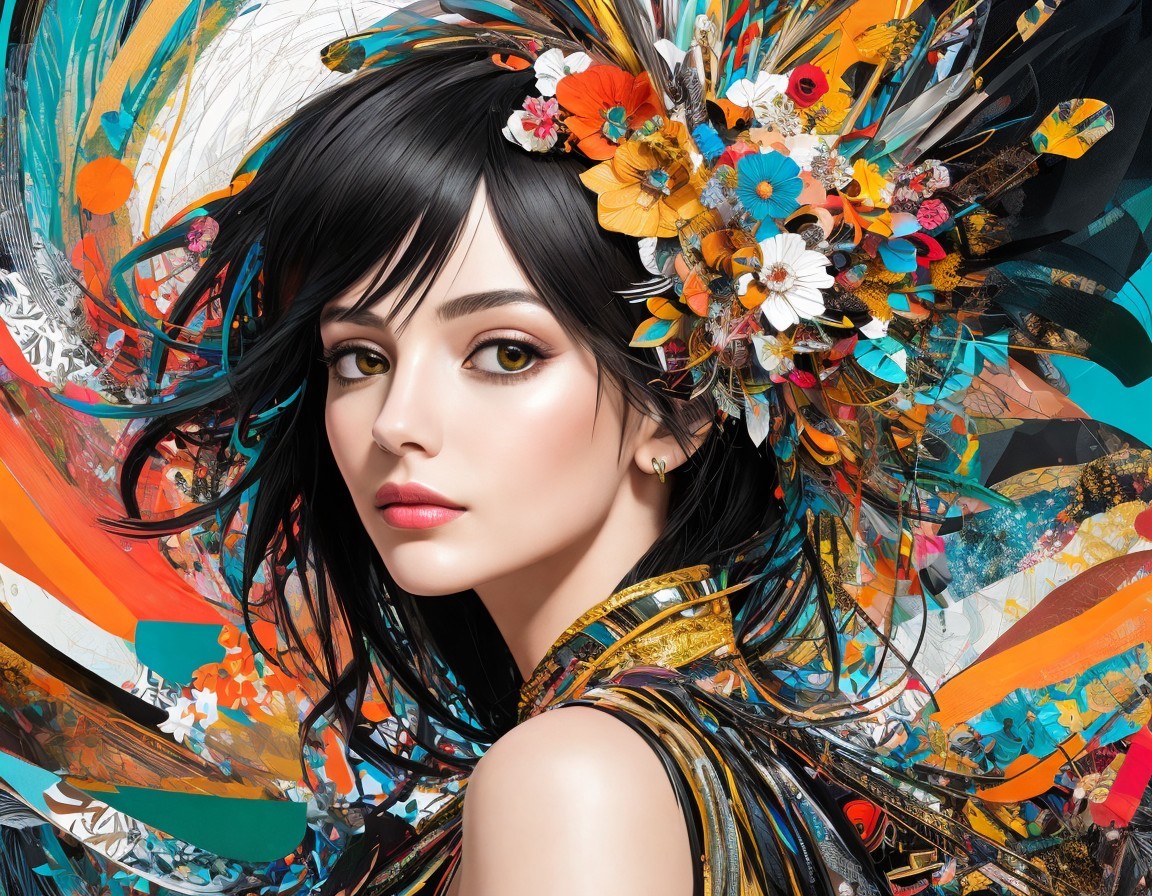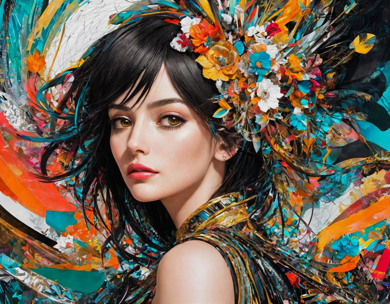 A woman with a vibrant, artistic splash of colors and flowers enveloping her hair, creating a dynamic and whimsical effect.