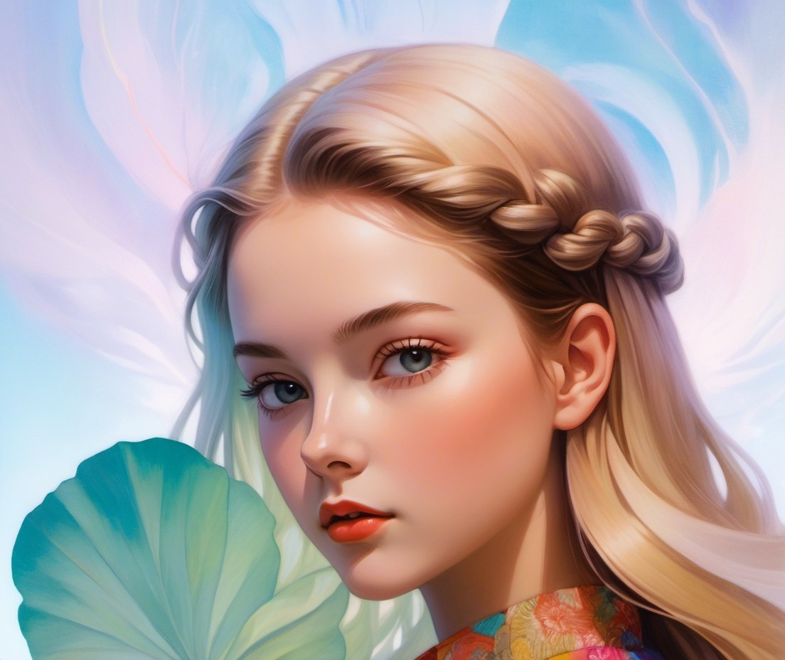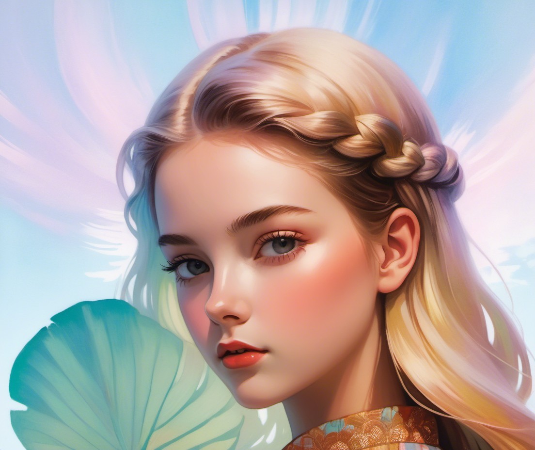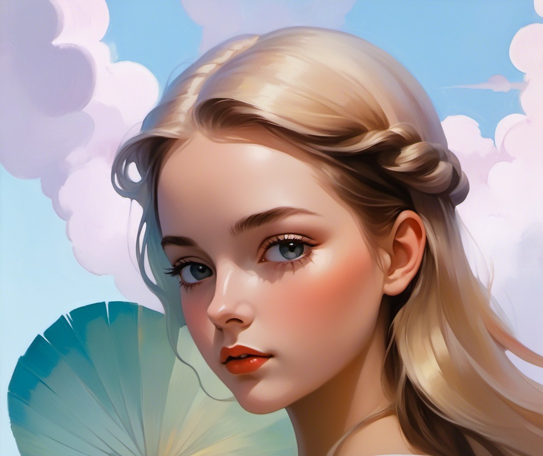 A portrait of a young woman with long, flowing blonde hair and striking blue eyes. She holds a fan, set against a backdrop of soft clouds and a blue sky, exuding an ethereal elegance.