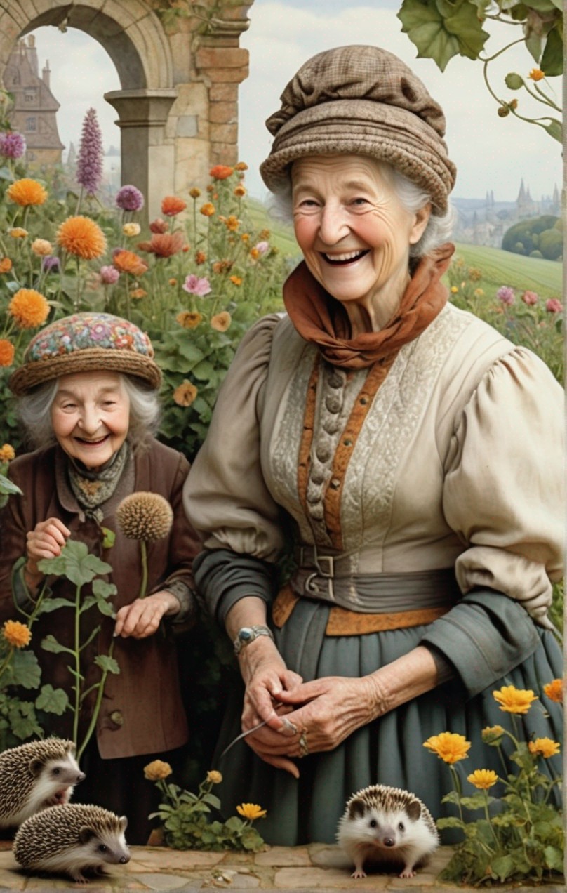 Three elderly women are joyfully holding and admiring cute hedgehogs in a sunny, flower-filled countryside setting.