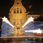 A low-angle, long-exposure photograph captures the motion of cars at night, creating light trails that lead to a blurred, medieval-style building. The light trails consist of two distinct colors: a cool-toned white-blue on the left and a warm-toned yellow-orange on the