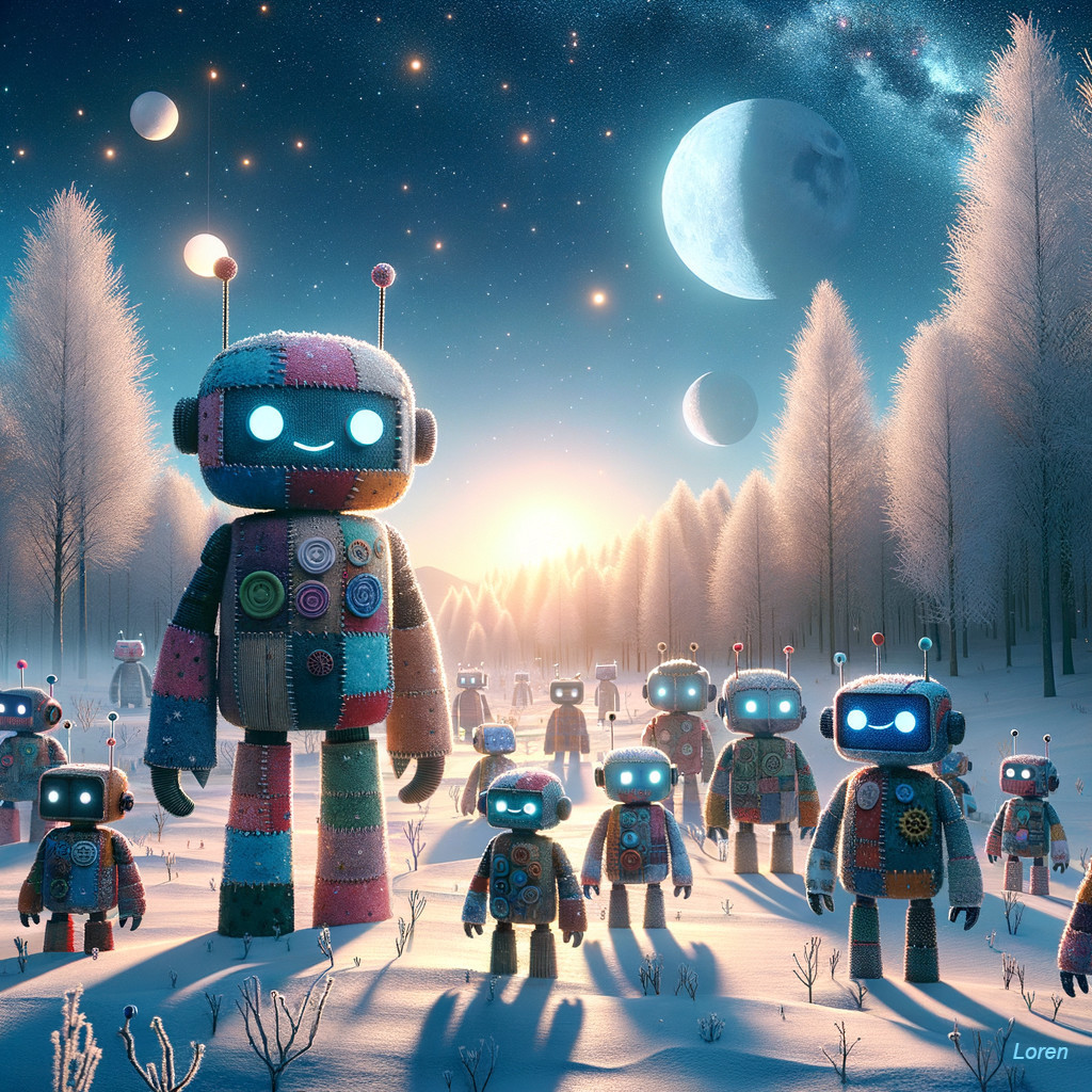 A group of patchwork robots stands in a snowy landscape at twilight, with a magical sky of moons and stars above them.