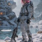 A figure stands in an icy landscape, dressed in ornate winter clothing. Equipped with a futuristic rifle, they gaze into the distance, surrounded by ethereal, snow-covered mountains and delicate structures.
