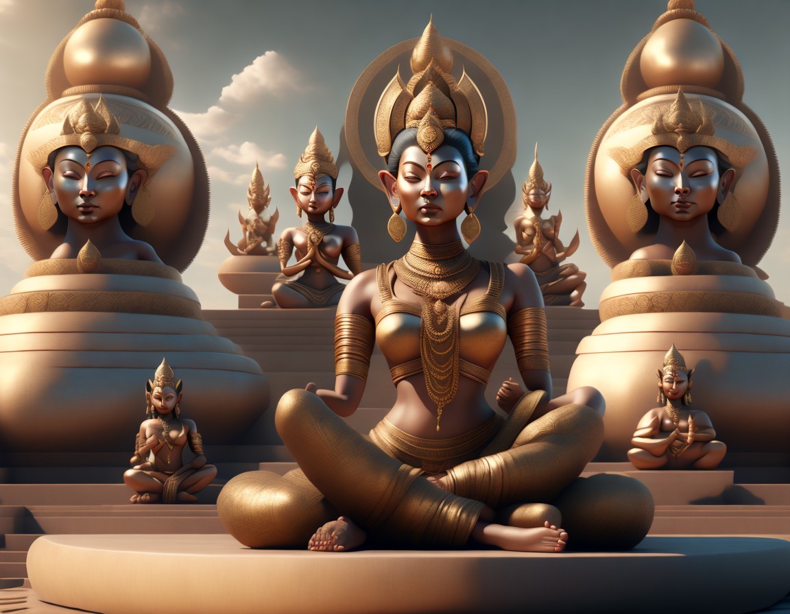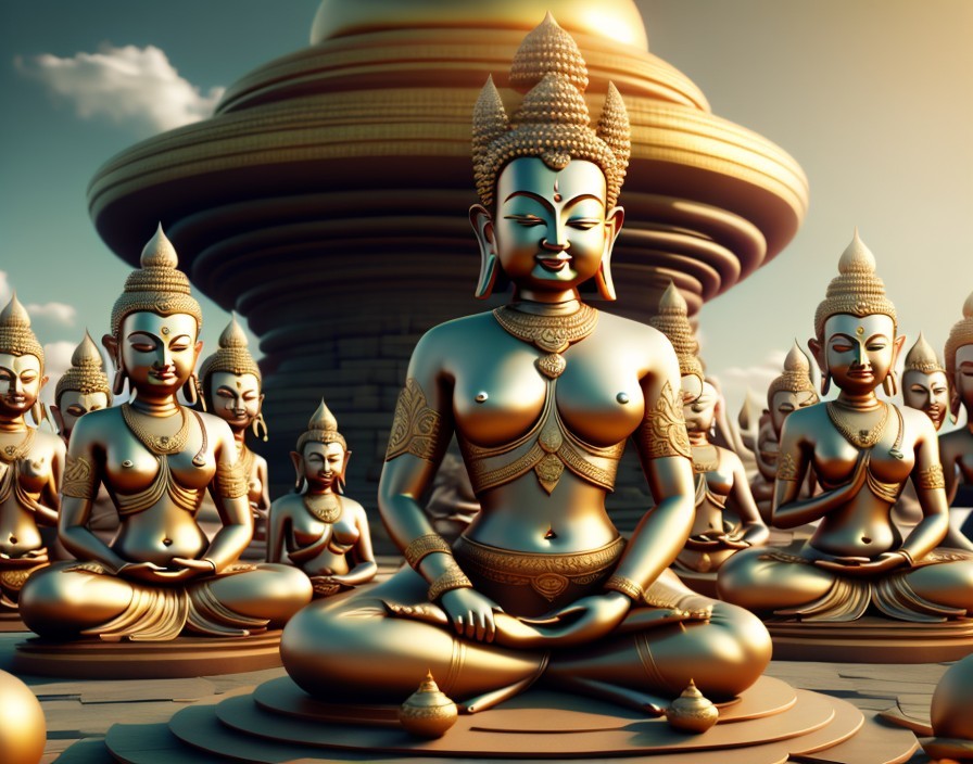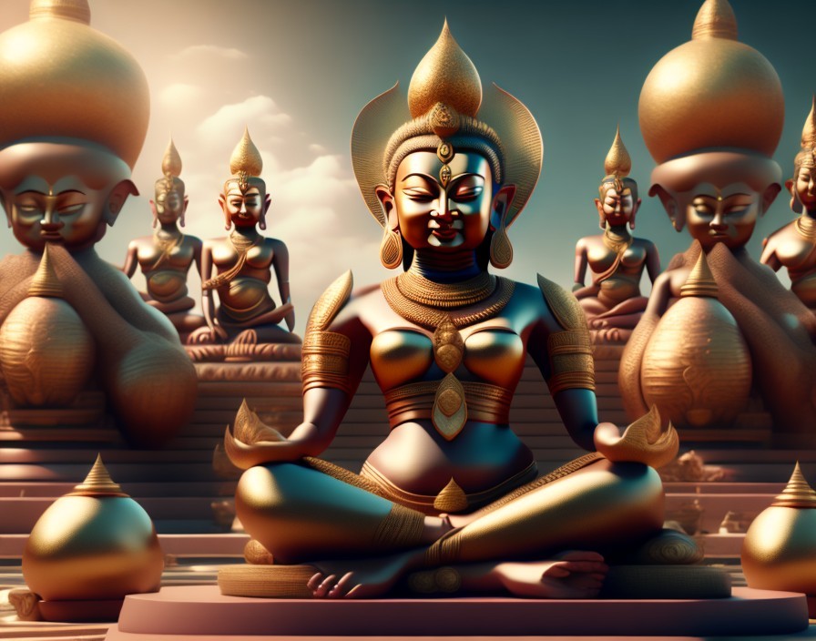 Rows of golden statues meditating on tigers, with a central figure highlighted, in an infinite, ornate hall.