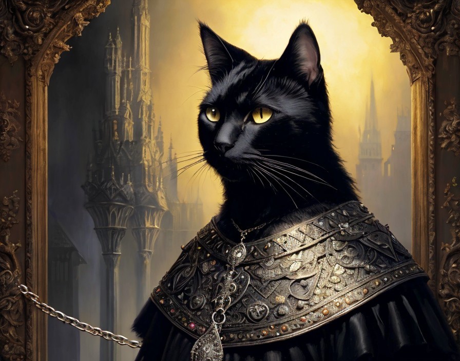 An artwork portrays two regal black cats, one adorned with a crown and the other in armor, set against an ornate mirror and a golden forest backdrop.