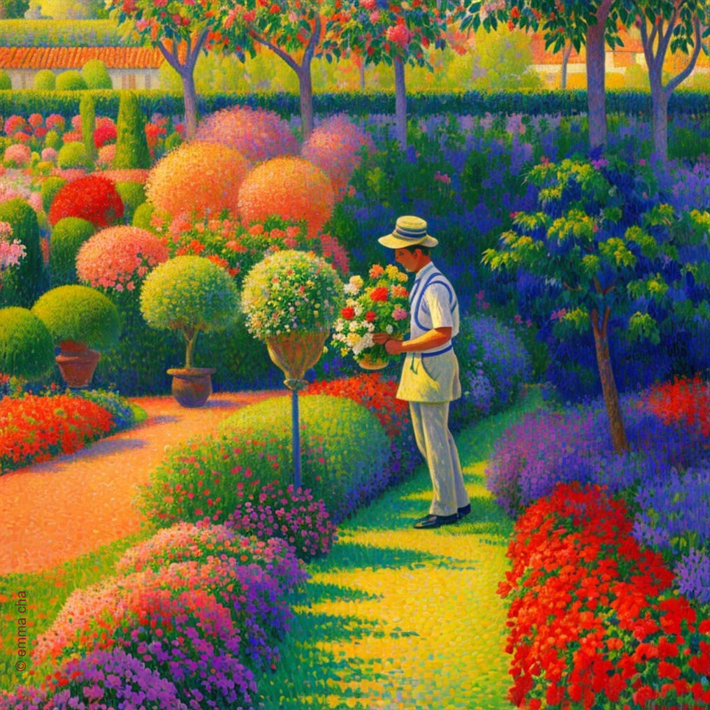 A vibrant painting of a gardener tending to lush, colorful topiary in a sunlit, flower-filled garden.