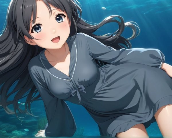 A charming girl in a cute anime-style bathrobe nightgown gracefully stands underwater, surrounded by shimmering bubbles and vibrant aquatic life, creating a whimsical and serene atmosphere.