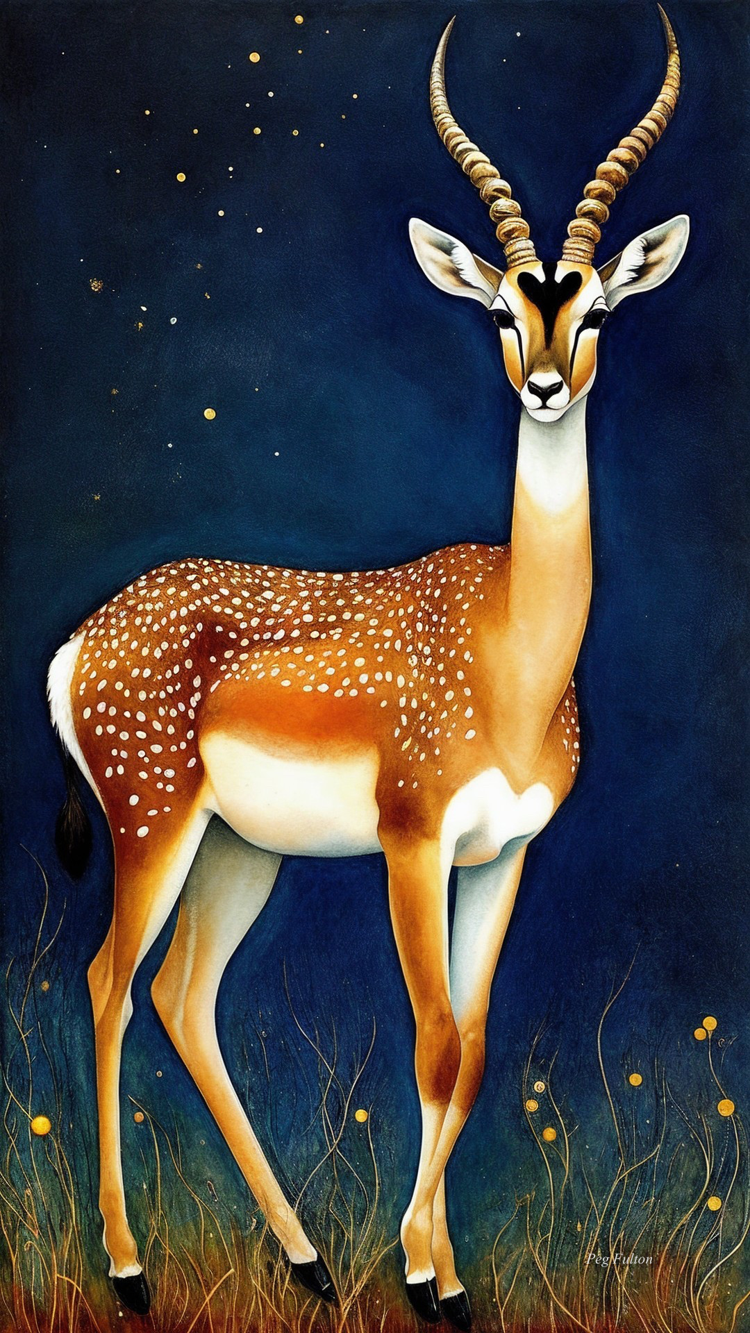 A beautifully stylized antelope stands gracefully against a deep blue background, adorned with golden spots and elegant horns, evoking a sense of serenity and artistic flair in its surroundings.