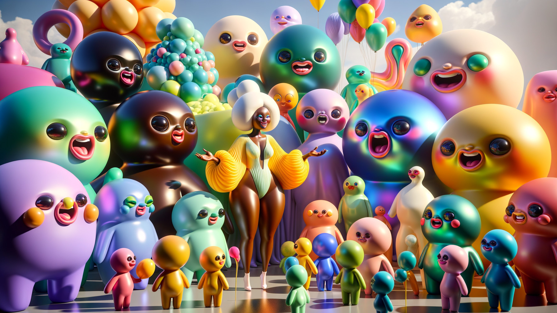 A joyful scene features a woman in a green swimsuit and fluffy yellow sleeves, surrounded by playful cartoon characters and colorful balloons against a cheerful sky.