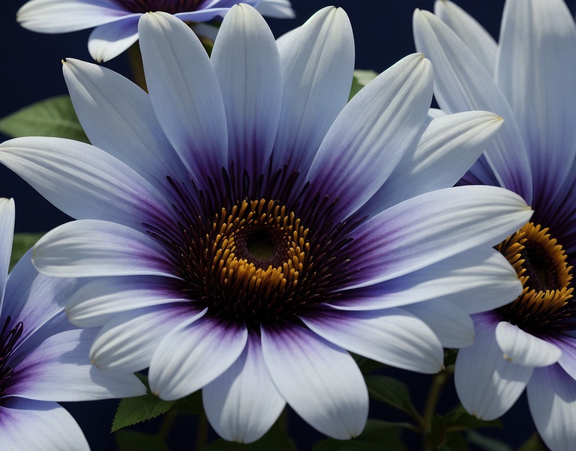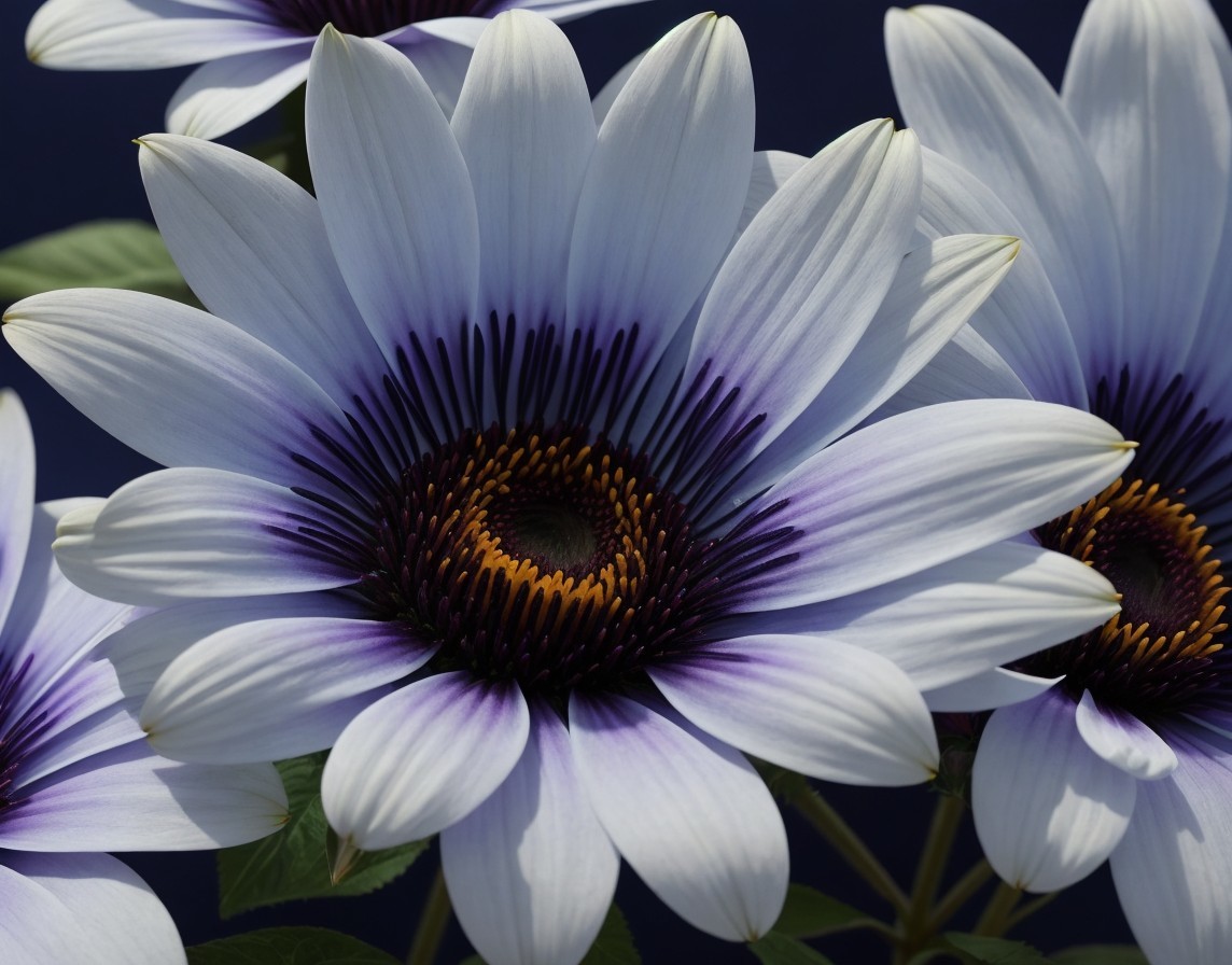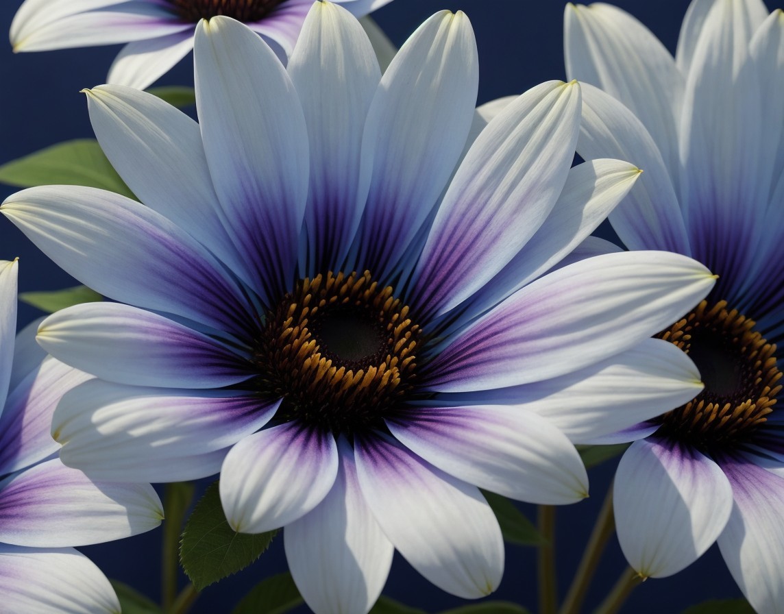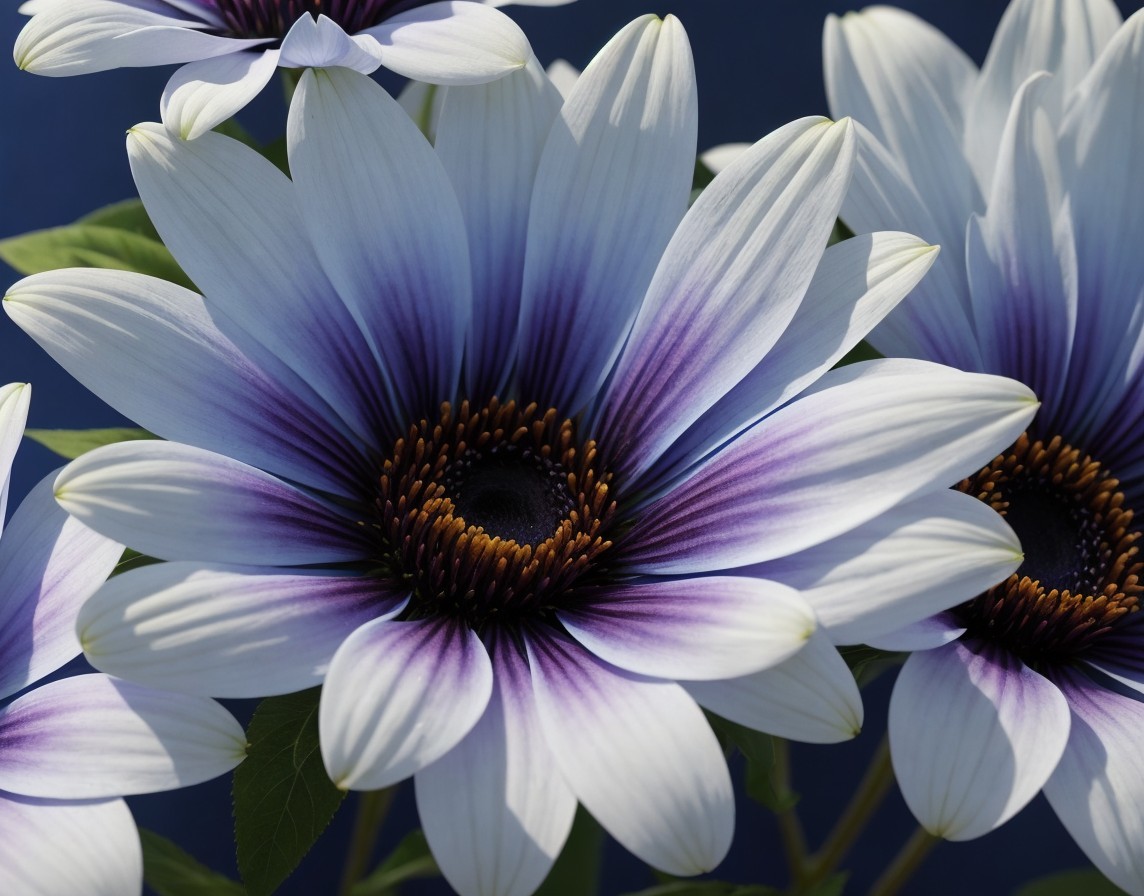 Close-up of purple and white flowers with prominent dark centers against a blue background.