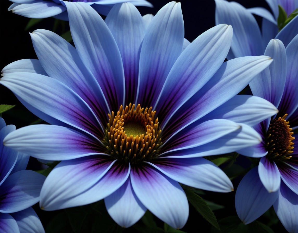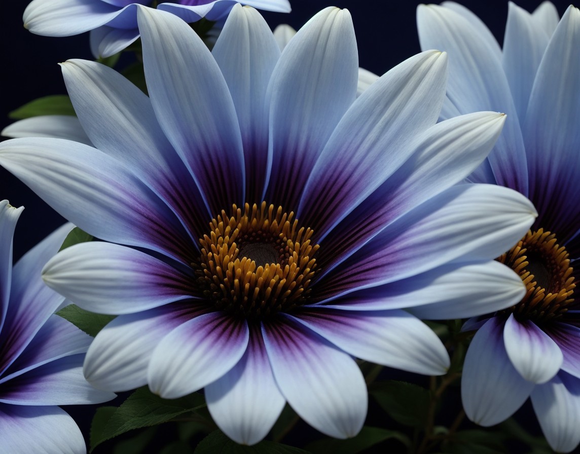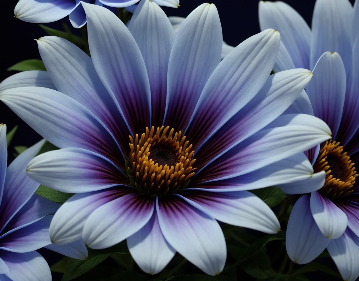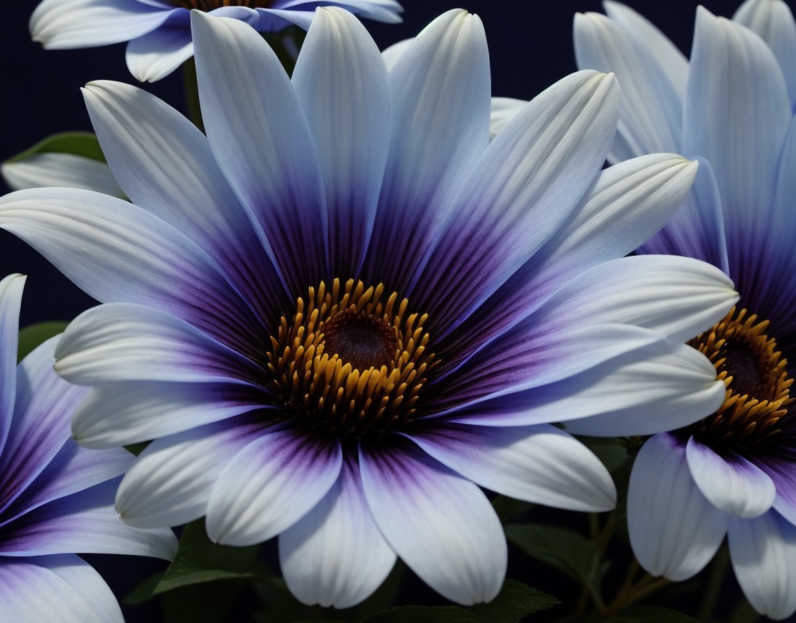 Close-up of purple and white flowers with prominent dark centers against a blue background.