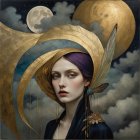 A surreal portrait of a woman with elegant features, adorned with golden ginkgo leaves in her hair. A vibrant blue butterfly rests beside her, set against a mystical moonlit background.