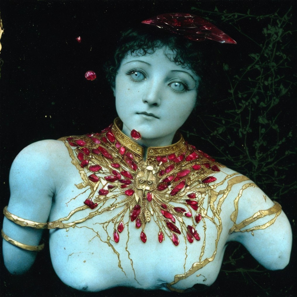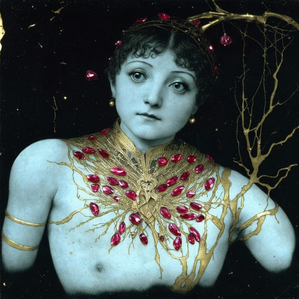 A portrait of a surreal, pale figure with golden, branch-like adornments and ruby embellishments set against a starry backdrop.
