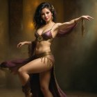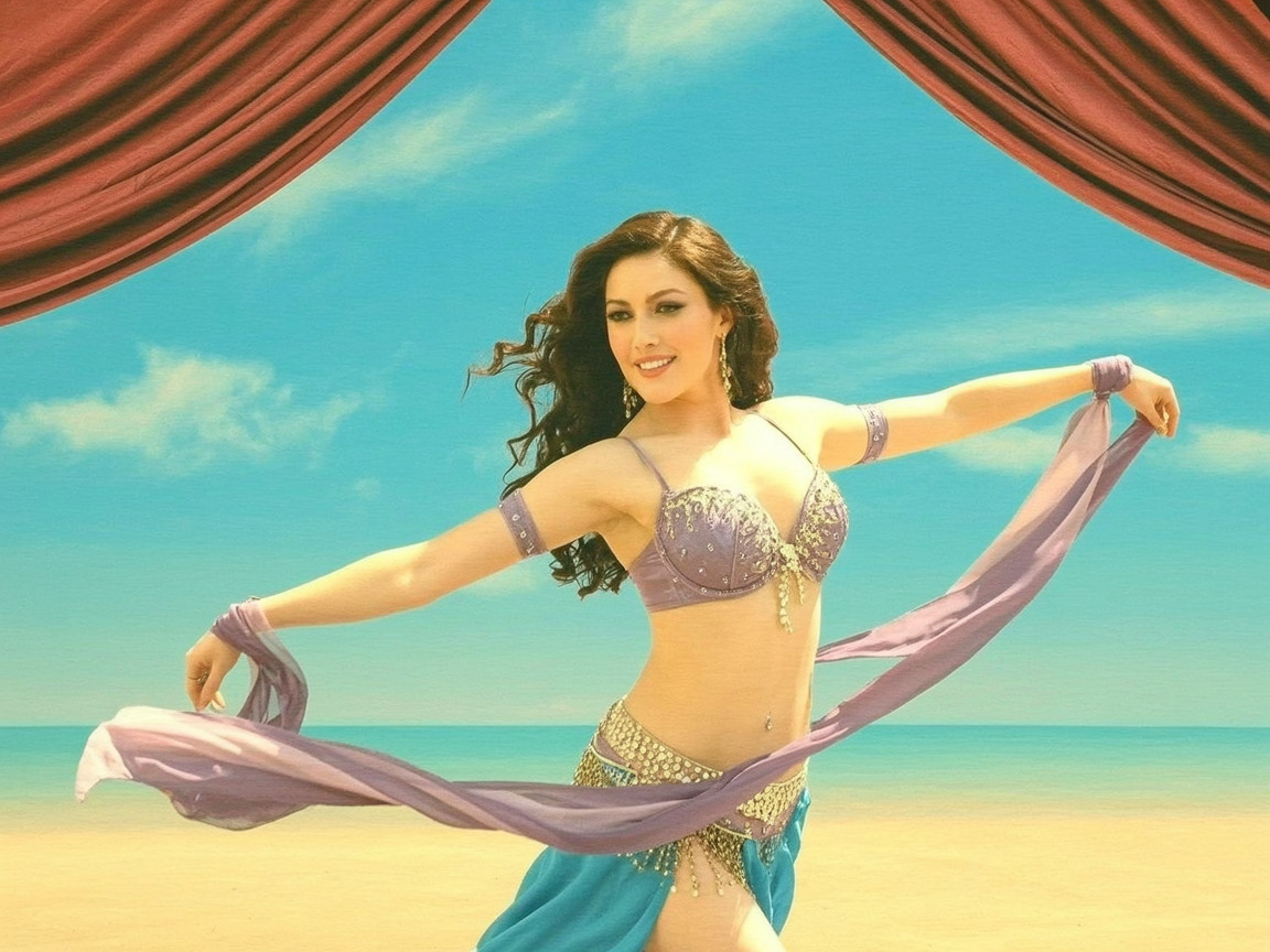 A dancer in a sparkling purple and blue costume gracefully poses against a serene beach backdrop, with flowing fabrics enhancing her movement and the vibrant sky above.