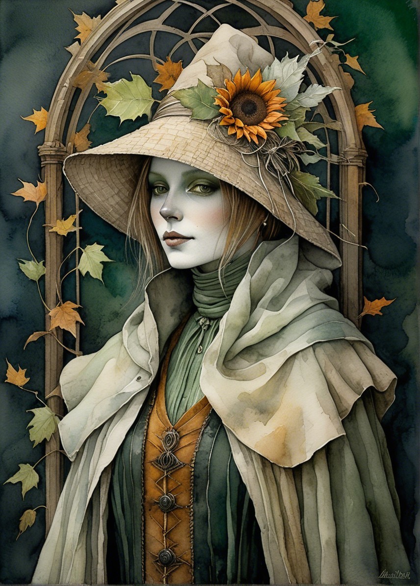 A whimsical figure in a straw hat adorned with sunflowers and leaves, wearing a flowing green cape and a lace-up dress. The background features soft, blended colors, enhancing her ethereal look.