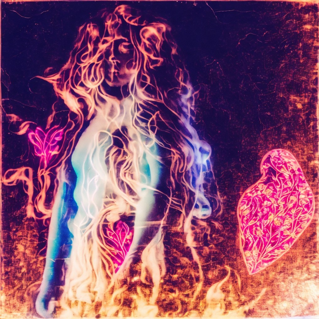 A woman with glowing attire stands amidst vibrant neon lights and intricate patterns, exuding a futuristic, magical aura.