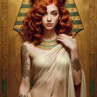 A woman with vibrant red curls wears a flowing, beige dress adorned with an ornate golden collar. Her arm features intricate tattoos of flowers, complementing sunflower motifs in the background.