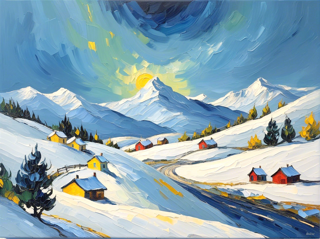 An impressionistic oil painting depicts a vibrant winter landscape with a village nestled at the base of snow-capped mountains under a bright sun. The sky is a dramatic swirl of blues, teal, and hints of yellow, suggesting dynamic movement. The mountains in the background are stark white with blue shading, their