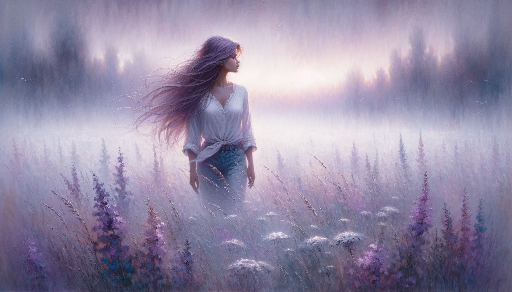 A woman with flowing hair stands amidst purple wildflowers in a misty, ethereal landscape with a pastel sunset.
