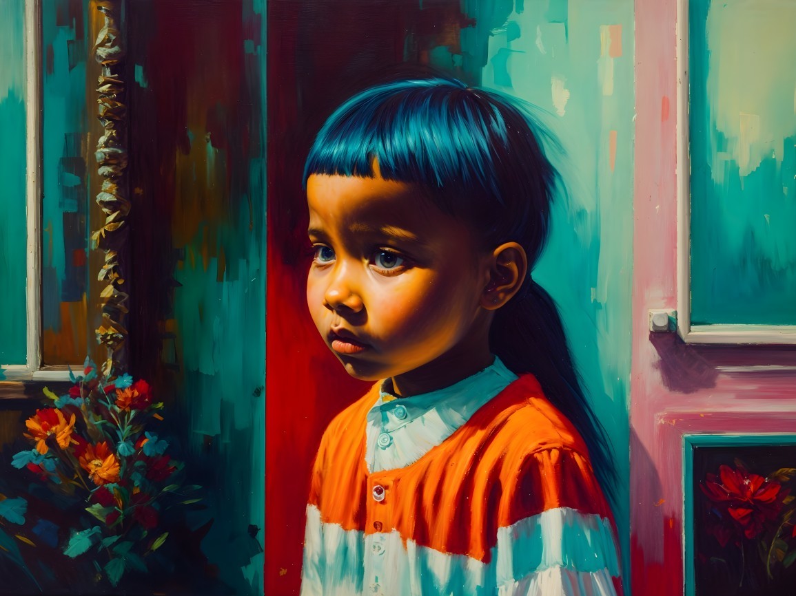 A portrait of a young girl with straight black hair, wearing a vibrant orange shirt. She stands by a colorful wall adorned with flowers, her expression thoughtful and introspective.