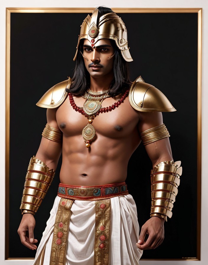 A man dressed as a warrior king with golden armor, crown, and regal white and gold attire.