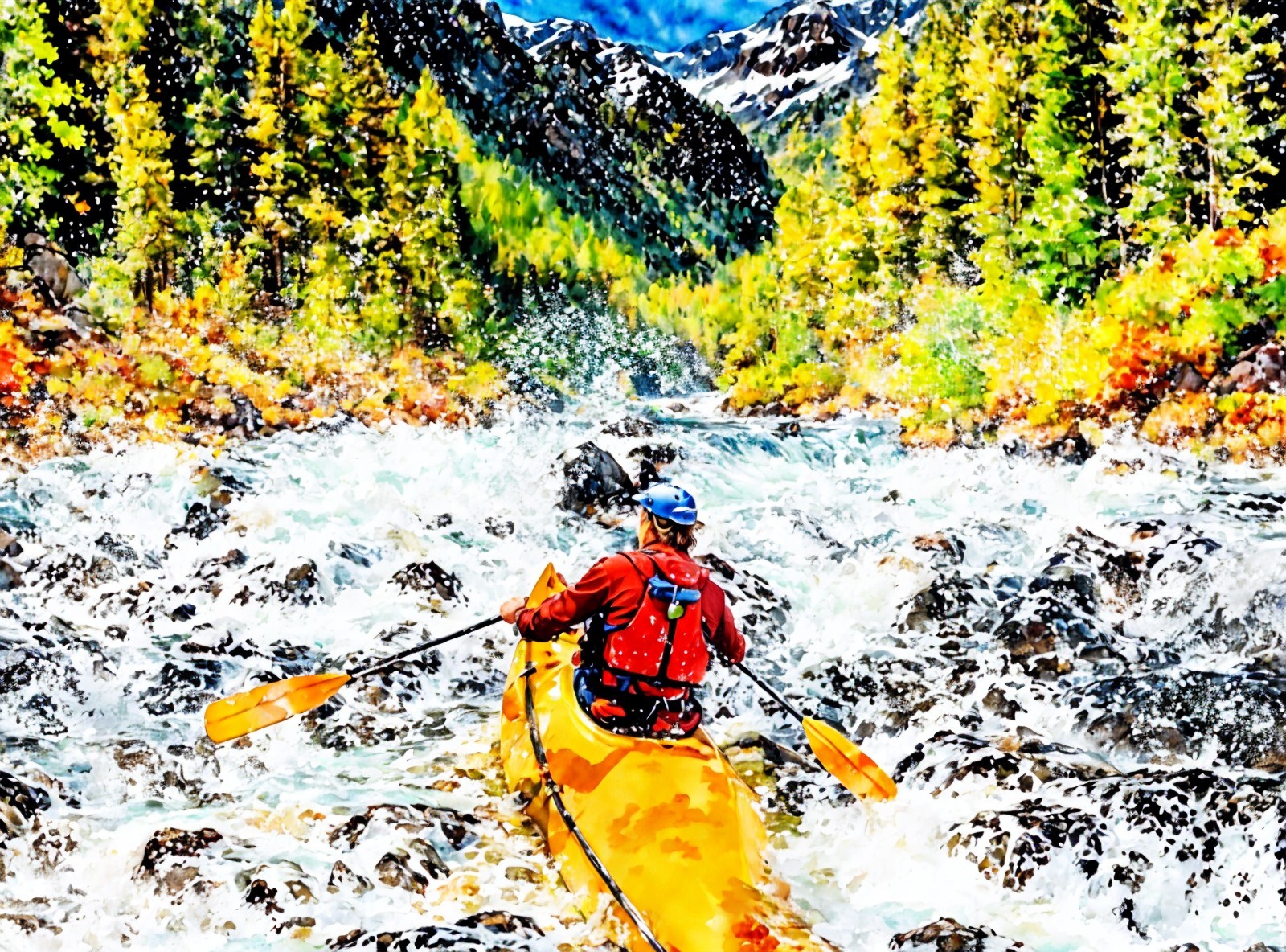 A kayaker navigates a lively river surrounded by stunning green trees and majestic mountains. Water splashes exuberantly as the orange kayak glides over rocky rapids, showcasing adventure and nature.
