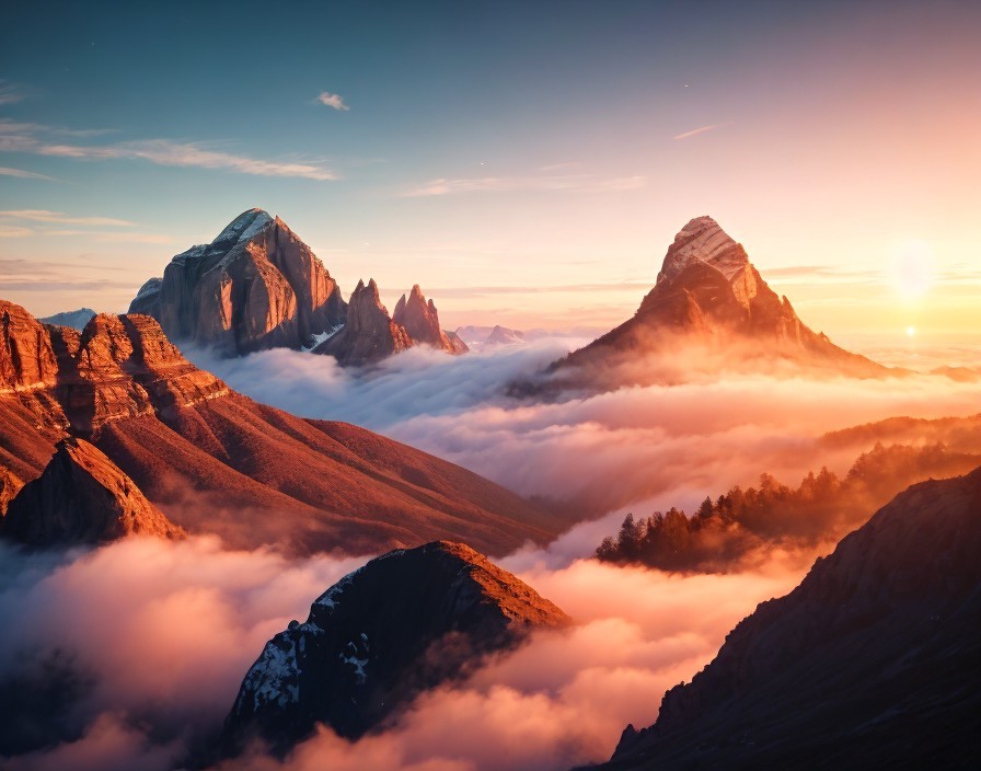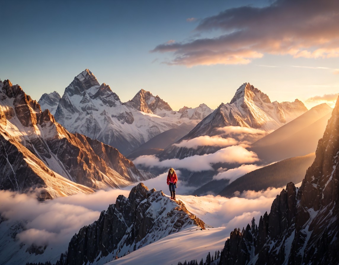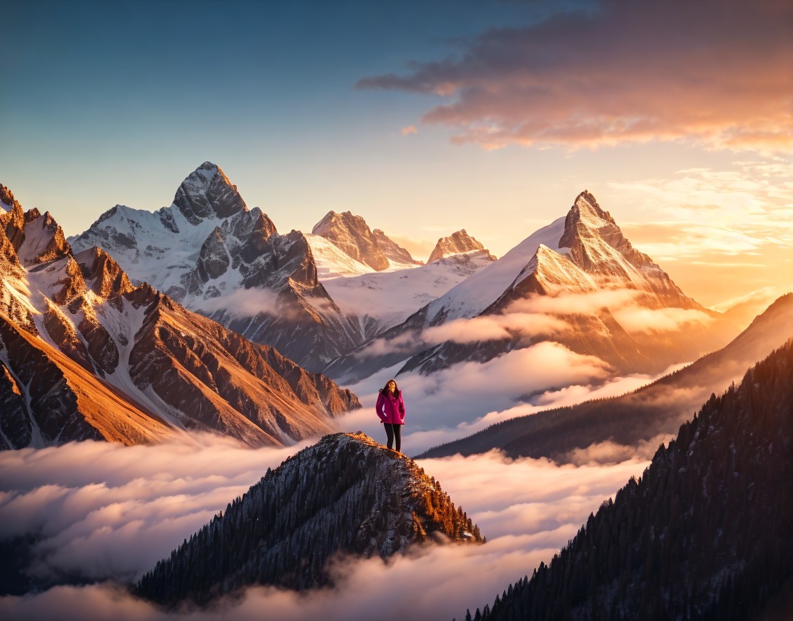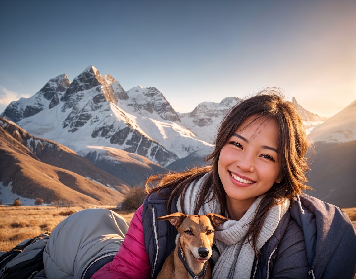 Here is the AI-suggested description, for completeness. "A smiling woman and her happy dog in front of snowy mountains at sunrise or sunset."