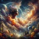 A dreamlike woman adorned with flowers gazes upward amid a vibrant cosmic backdrop filled with swirling clouds, planets, and glowing colors, evoking a sense of wonder and tranquility.