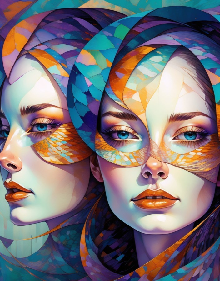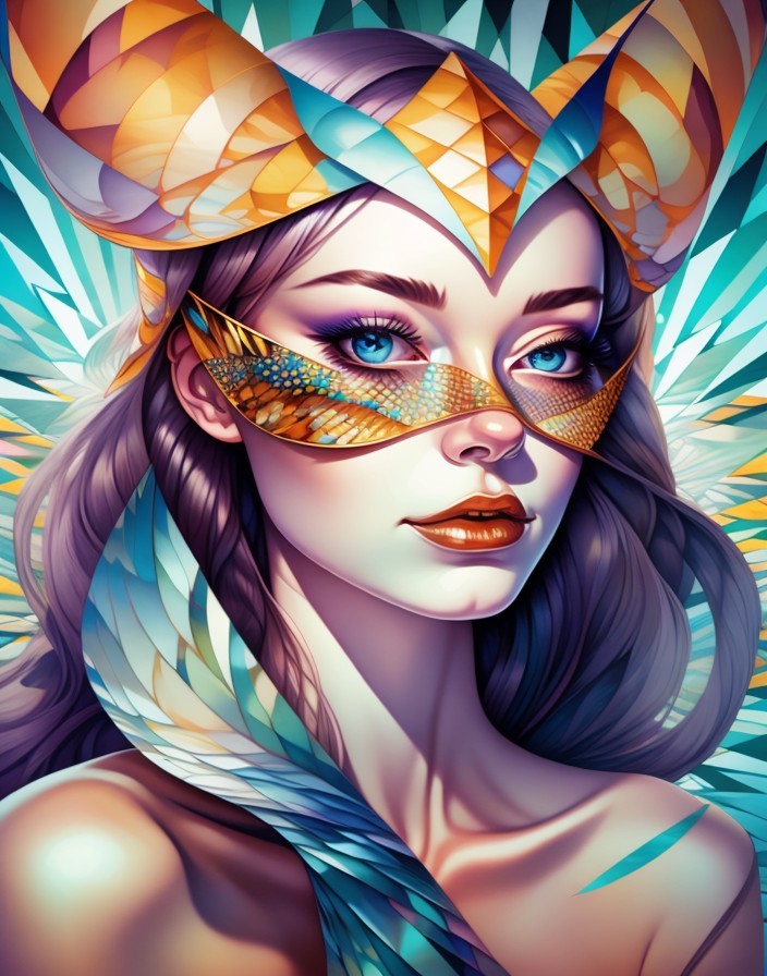 A digital artwork featuring a woman with a golden, feathered mask and radiant blue background, exuding a mystical and elegant aura.