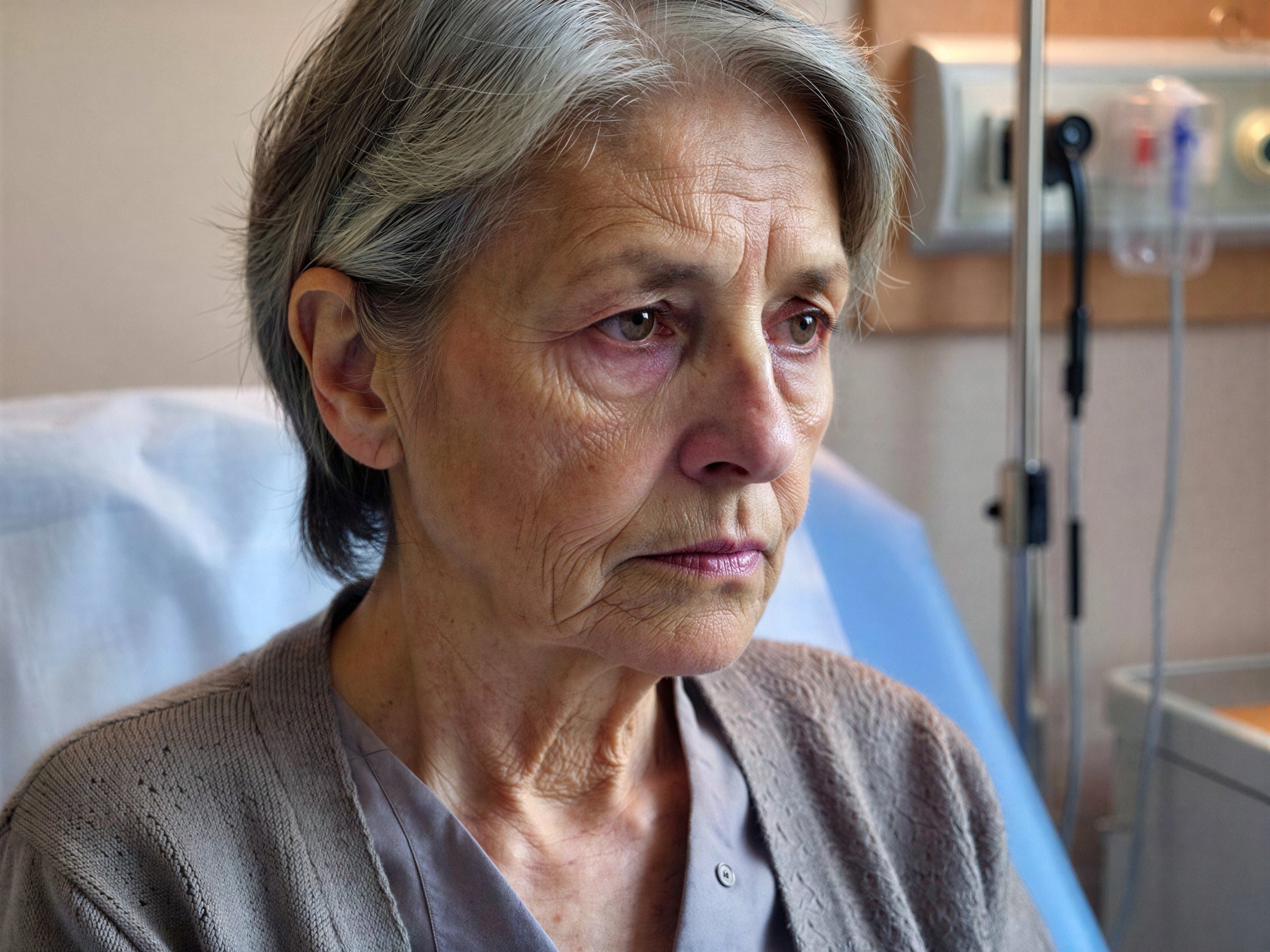 A close-up shot of an older woman with short, gray and dark hair, and brown eyes, looking to the right with a somber expression, wearing a gray knitted cardigan over a gray collared shirt, in a room with a light blue examination table or hospital bed and medical equipment in the