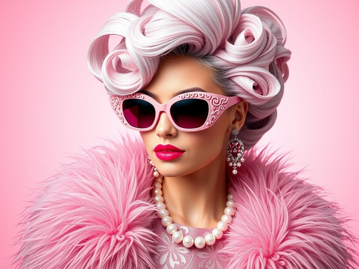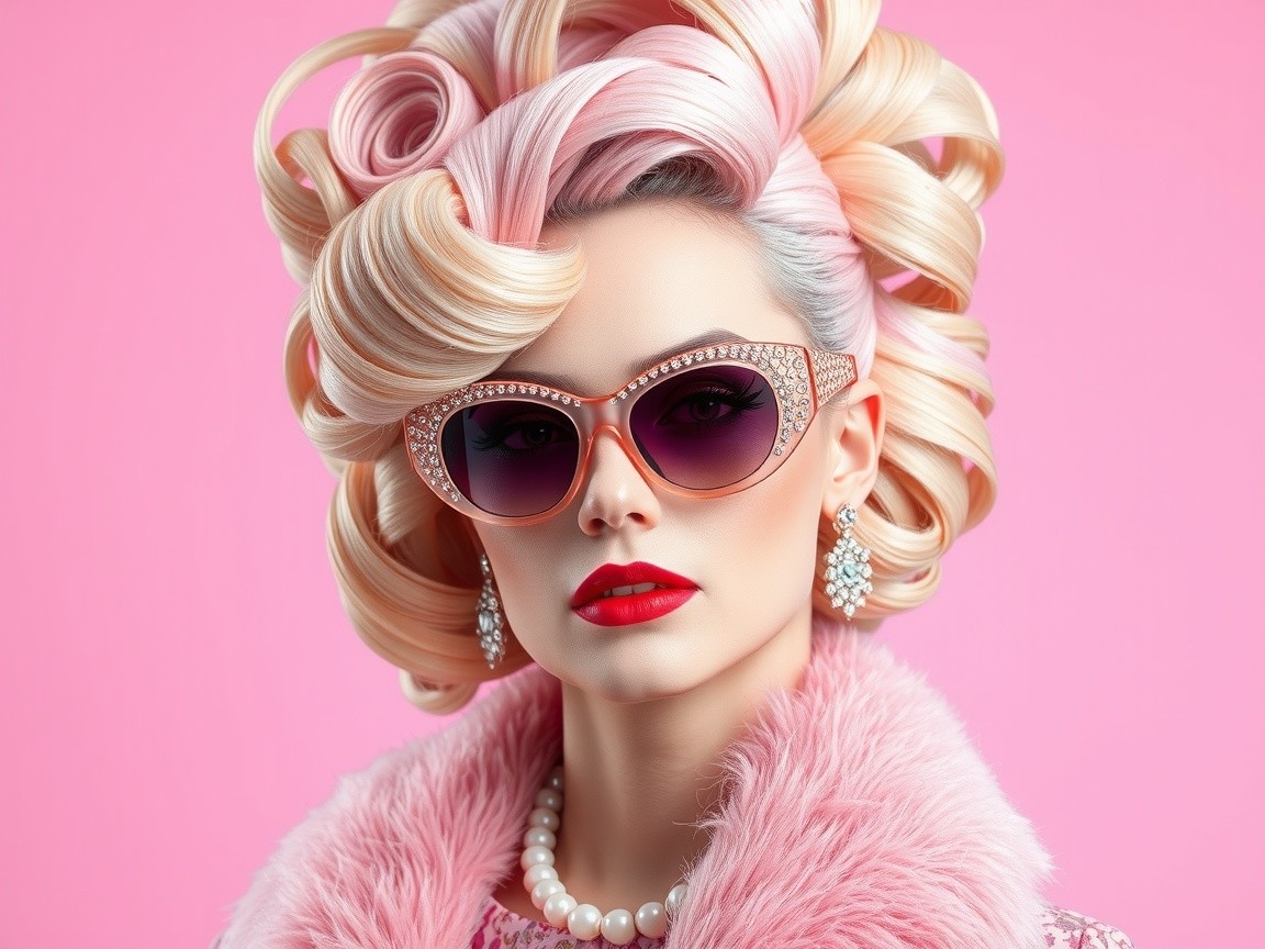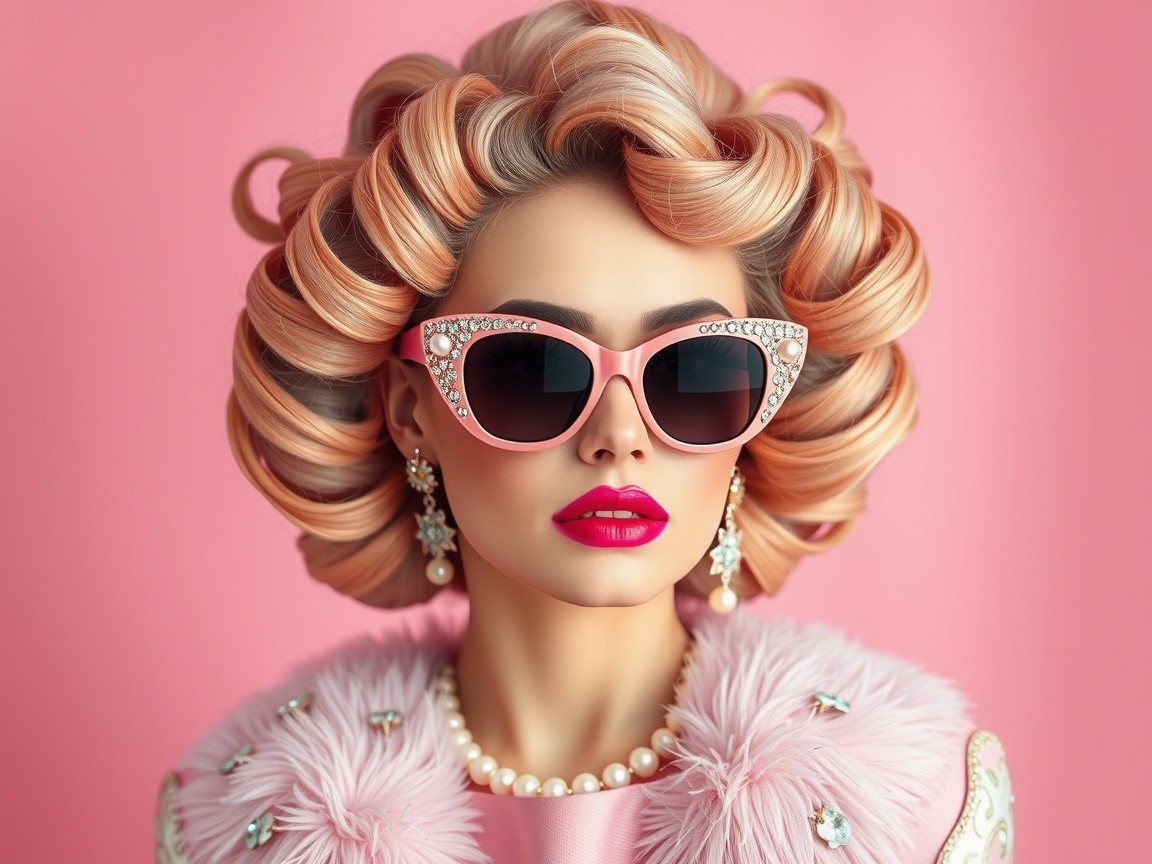 A glamorous woman with voluminous, soft pink curls exudes elegance. Her refined features and bright pink lips are highlighted by oversized pink sunglasses. Dressed in a luxurious floral pink outfit with a fur collar, she accessorizes with pearl jewelry and sparkling earrings against a soft pink gradient backdrop, embodying high fashion and sophistication.